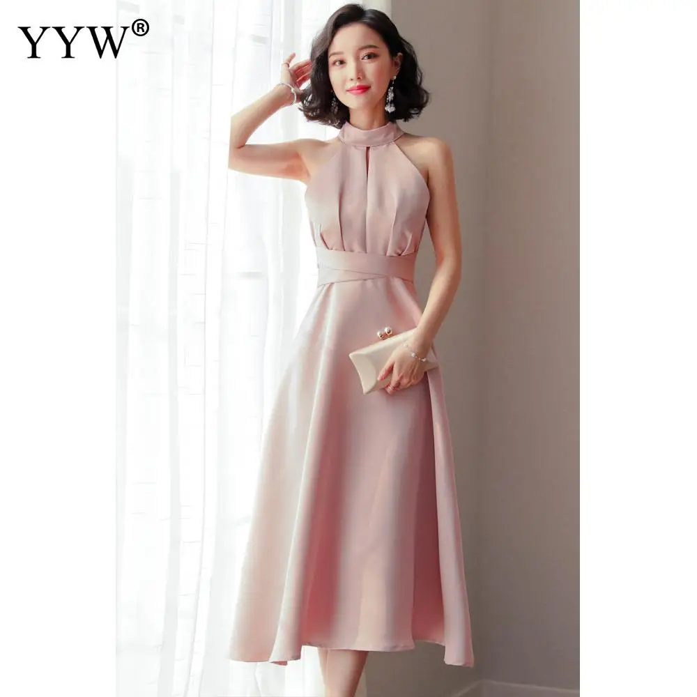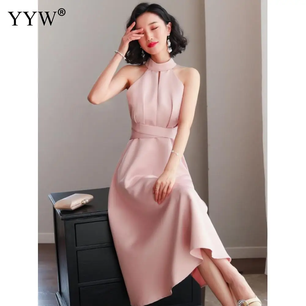 HOT Sale Pink Elegant Evening Dresses 2019 Fashion Sleeveless Halter Party Dress Women High Waist Female Sex